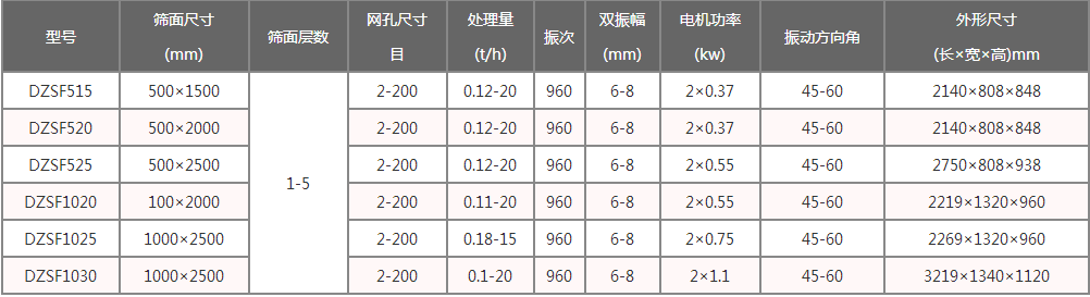 4.直线振动筛型号有:DZSF-515、DZSF-520、DZSF-1020、DZSF-1025、DZSF-1030、DZSF-1035、DZSF-1540等多种规格型号;不同型号的直线振动筛的价格就是不同。其中影响型号的的因素有:筛网(1—5层)、材质(不锈钢、碳钢)、振动电机(功率不同)等。