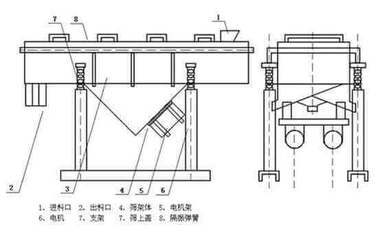 7、支架:由四个支柱和两个槽钢组成,支持着筛箱,安装时支柱必须垂直与地面,两支柱下面的槽钢应相互平行。